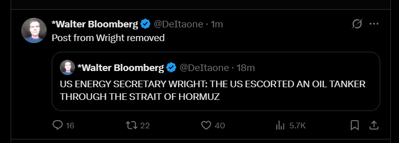 Not only did Trump manipulate markets higher yesterday afternoon, but a post by US Energy Secretary Wright that "The US escorted an oil tanker through the Strait of Hormuz" WAS REMOVED this afternoon - but of course after oil dumped!
