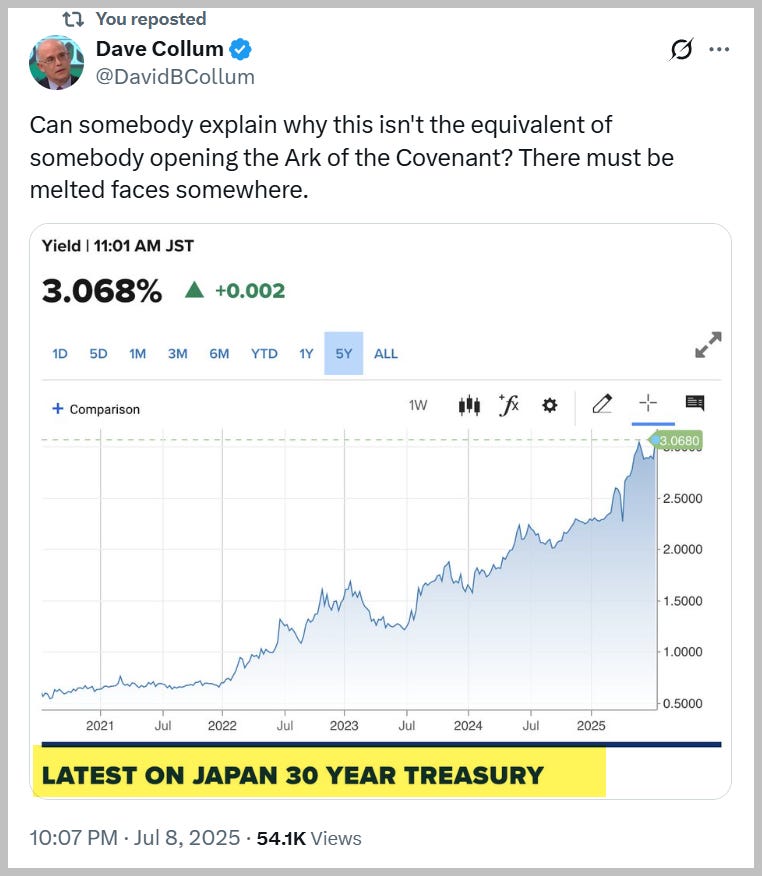 Japanese Elections are 7/20 - one year after I warned about the yen carry trade unwind July 19, 2024. Maybe it’s nothing, but I will be stalking USDJPY very closely as the 30Y JGB yield starts to “melt faces”.