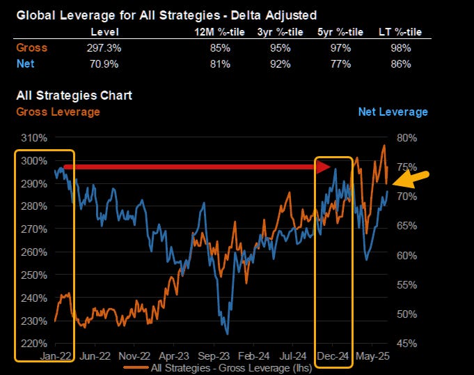 As for the fuel left in the tank from the overall hedge fund folks, GS + JPM say they are not yet max net leveraged: