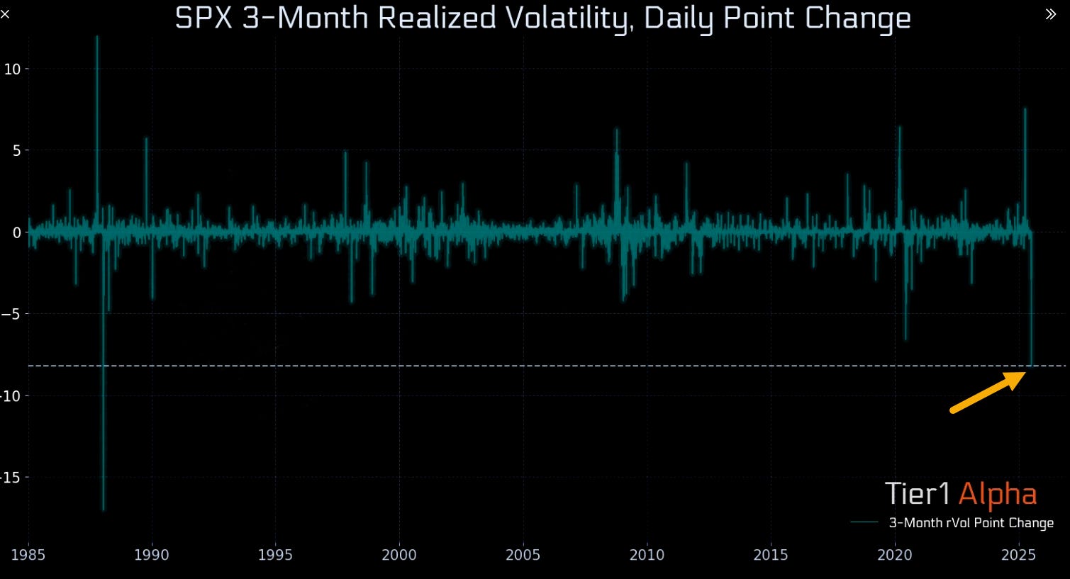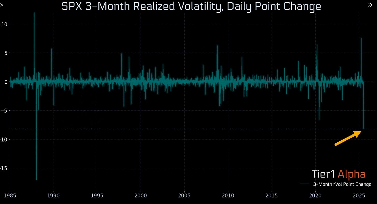 Case in point: SPX 3 month realized volatility just crashed, marking the largest single-day decline since 1987.