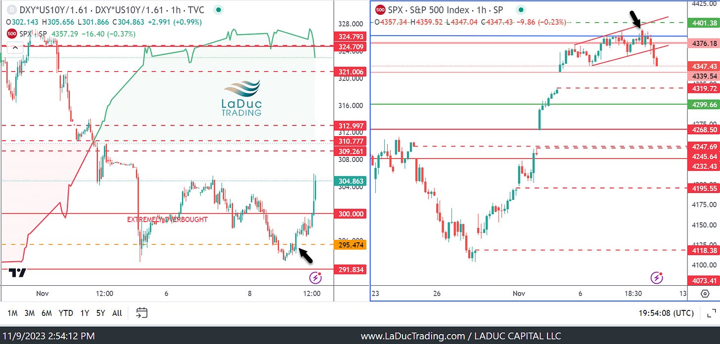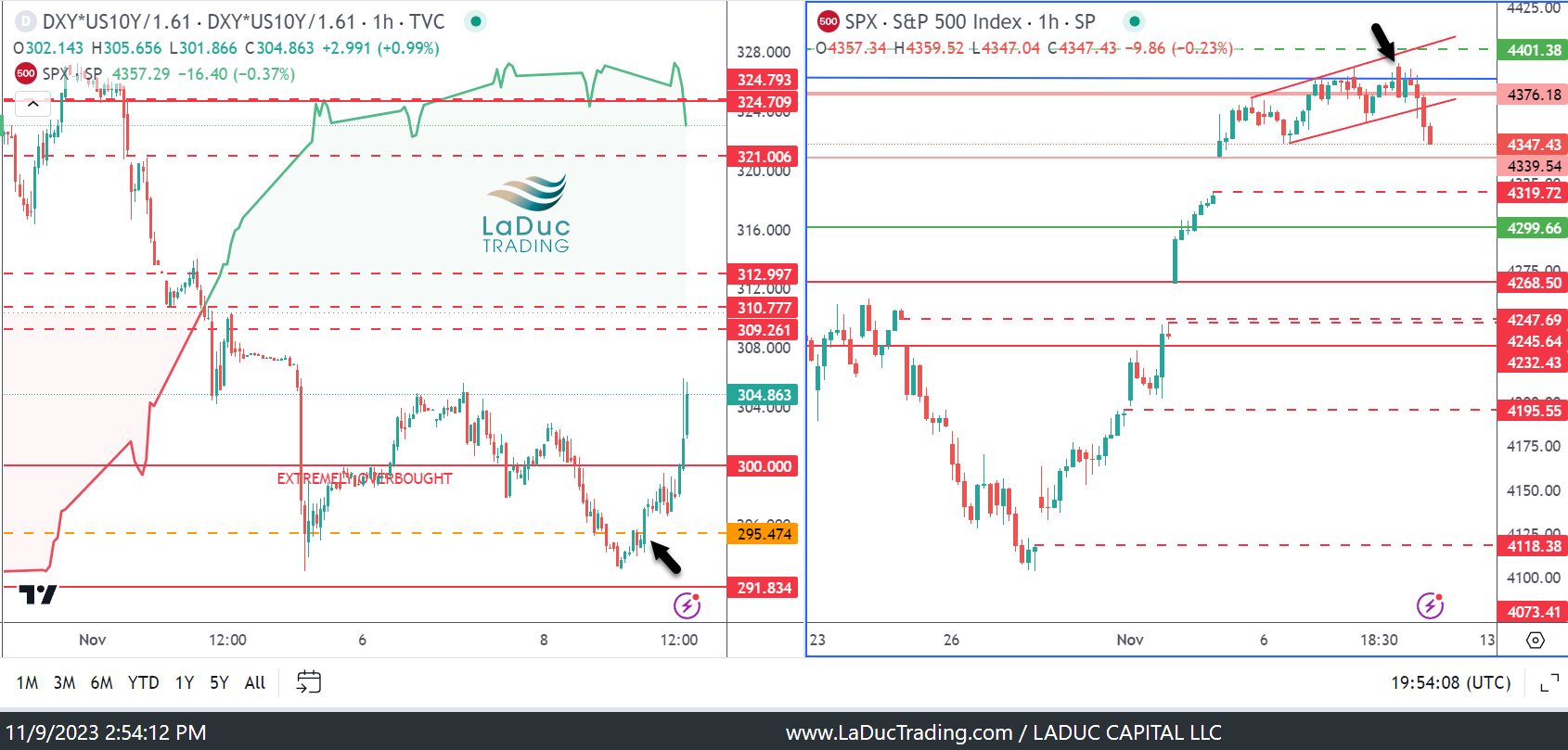 I also said, "Logic would dictate, market is exhausted". My baseline bet this morning in my live trading room was that we would not get above a key intraday level - as shown (black arrow) at blue trendline on the SPX chart (side-by-side with my USD/10Y ratio chart). We did a Pinocchio peak above for a New York minute, then dumped to form a perfect bearish engulfing bar on the hourly. It was the closest thing you get to a sure-thing short. (chart below).
