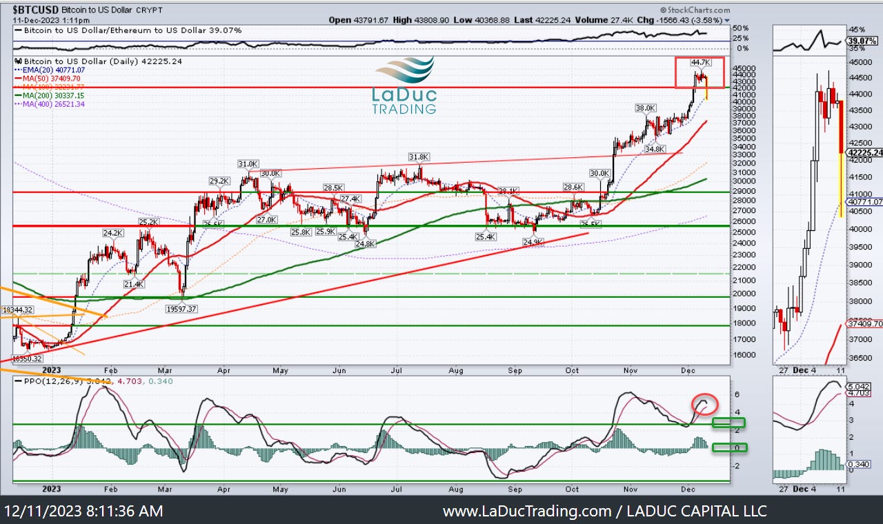 (See chart of reversal back below monthly resistance at $42K on way back to $38K as the momentum indicator (bottom panel) rolls over.)