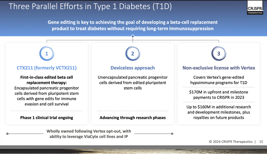 Under one of the agreements for diabetes, Vertex will pay CRISPR Therapeutics $100 million up-front for non-exclusive rights to CRISPR Therapeutics’ technology for the development of hypo immune gene-edited cell therapies for Type 1 diabetes. CRISPR Therapeutics will be eligible for up to an additional $230 million in research and development milestones and receive royalties on any future products resulting from this agreement. Basically, VRTX will have significant rights to the revenues and profits from the diabetes therapies.