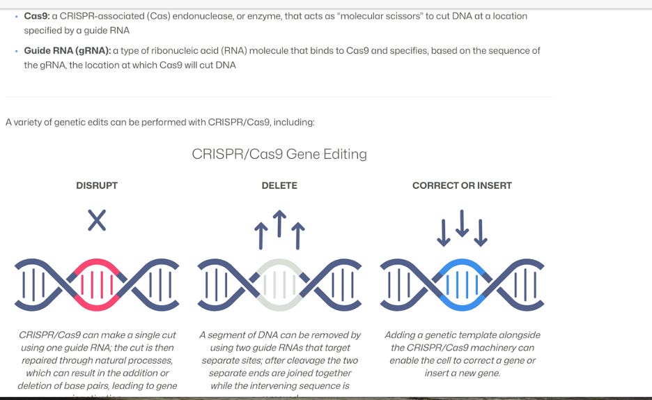 CAS9- the enzyme that cuts DNA and a guide RNA sequence which combined and targets the DNA target in question. The complex targets a DNA sequence directly next to the DNA sequence we need to correct. This Cas-9 RNA complex unwinds the DNA sequence that is just before the target and then allows the RNA sequence to bind with the DNA target. The Cas 9 then cuts the target DNA sequence creating a double strand break. The cells natural repair mechanisms come in to repair the sequence, sometimes this results in deletion of additional base pairs and deletion of the entire target sequence in question and inactivating the gene. In other cases, if one inserts a new DNA template, one can replace the original inherited faulty sequence with a new sequence and thus change a nutated gene to a fully repaired gene.