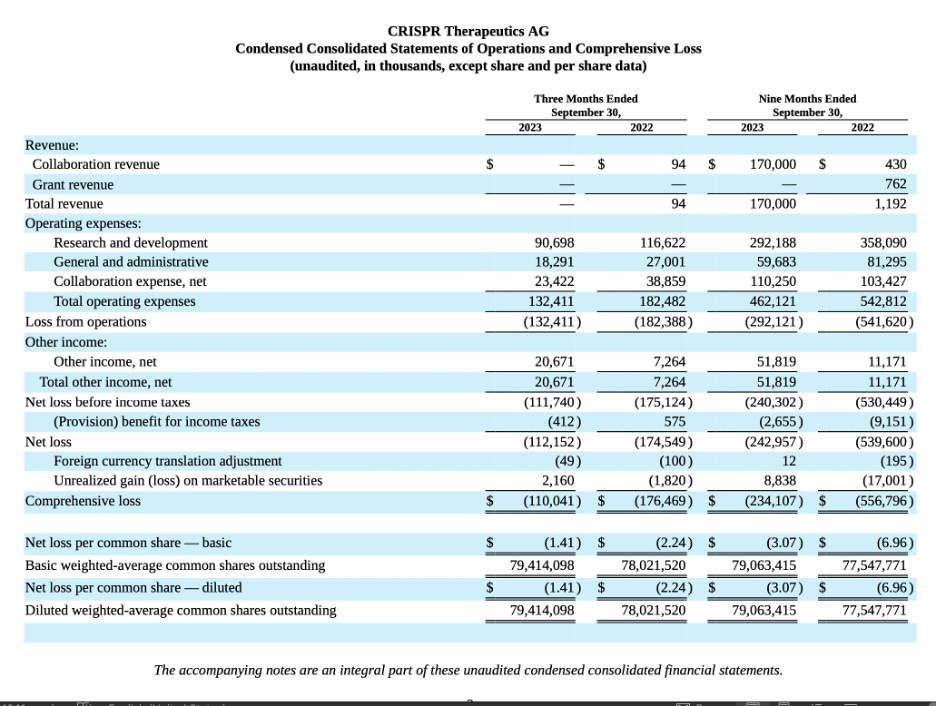 Here is their financial picture for the first 9 months of 2023… Note how revenue has jumped, mostly from the collaboration agreements for now. They will have plenty of cash to work with to develop these other therapy lines and they already have an established facility for their research and development of their cell lines and gene editing programs.