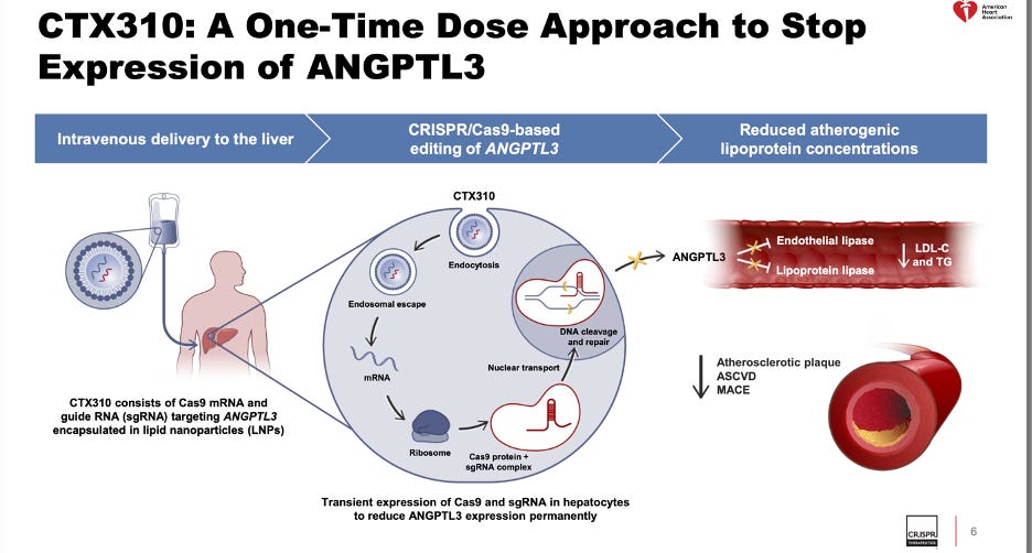Example: High LDL cholesterol. The LDL cholesterol is the “bad cholesterol associated with heart disease. They are targeting the enzyme in the liver that produces LDL. If they knock out the gene that makes the enzyme that makes LDL cholesterol, then they theoretically decrease heart disease. The illustration is below. This trial is in phase 1