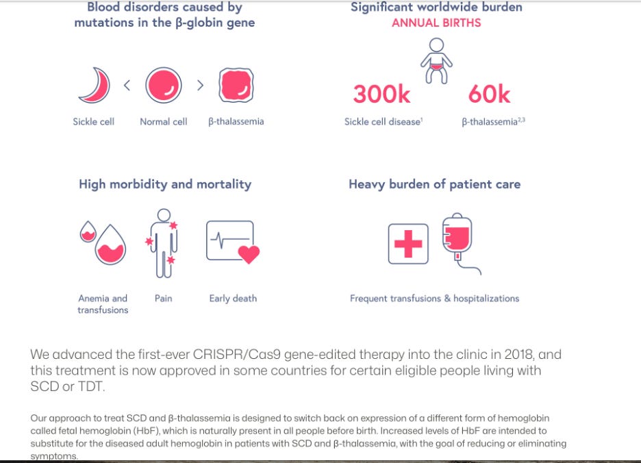 The approved therapy ( CASGEVY) for Sickle Cell Disease is to delete the sickle gene entirely ( this is an altered Beta chain in the Hemoglobin molecule that causes blood cells to get hard and stick together which causes thrombosis and pain and necrosis of limbs and organs in affected patients- this is called sickling) and allow production of the patients fetal hemoglobin and thus decrease sickling. This is a collaboration with VRTX.