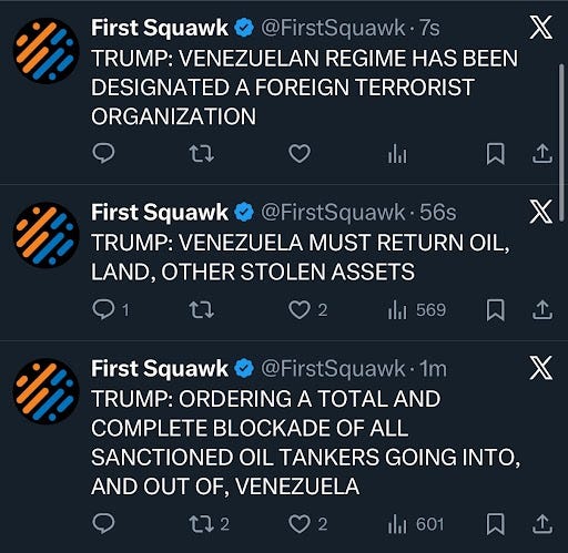 President Trump ordered a full embargo / blockade of “sanctioned” oil tankers from Venezuela - as cover, he called the Maduro government a terrorist regime. Some are expecting Trump is laying the groundwork for military action while others think it is ‘but a flex’ to assert dominance over Venezuela in general, but South America in particular - as Trump would not like VZ to sell their heavy crude to China/India/Other, but instead seize it and send it up to American refiners for processing.