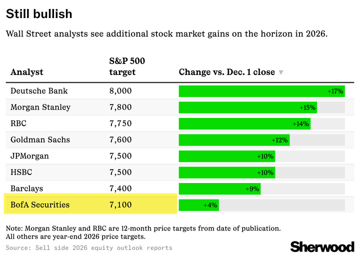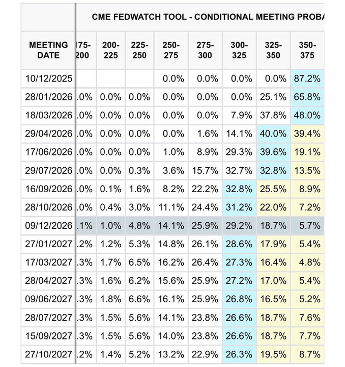 Expected Rate Cuts 2026 - Next year, market implies ~20% for 4 more cuts, which is equal to ~5% of SPX upside per cut, so 4 cuts is equal (in a bull’s mind) to ~20% gains - which market has been front-running of course and will continue to until earnings disappoint. But this is how CME rate cut table helps to generate SPX targets in part. I like the highlighted odds of only 5% higher or $7100 SPX 2026. It’s not good to get too greedy. Obviously, you can see there are no downside targets because * they * are not expecting Fed not to cut or earnings not to grow. Big IF true.