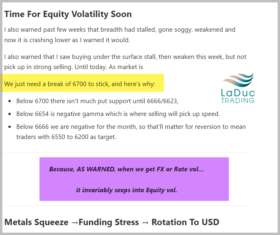 IT HAS STARTEDSamantha LaDucOct 10, 202531ShareI did warn!!Time For Equity VolatilityMetals Squeeze →Funding Stress → Rotation To USDSamantha LaDuc·Oct 9Let’s talk about your dollar & precious metal trades…Read full storyIf you have SLV, consider rotating to PSLVRemember the TLT NOV 90X95 Call Spread for a trade?Also, VIX is spiking now as I warned...SPX & QQQ is crashing on cue. UPGRADE TO PRO OR JOIN US LIVE AT LADUCTRADING.COMSubscribePreviousNext
