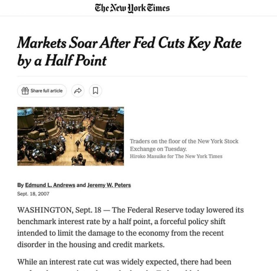 "Over the past 40 years, the Fed has cut rates 12 times when the S&P 500 $SPY was within 1% of an all-time high. The market was higher a year later all 12 times, with an average return of around 15%."
