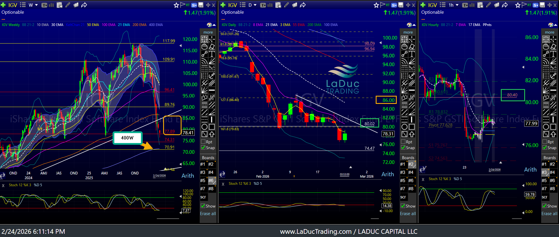 The very popular software index, IGV, is poster child of the tech wreck, after wiping out two years of gains and nearly a $trillion in market cap. I did say past few weeks when many were trying to catch this falling knife to let it fall. Now that it has hit 77.89 monthly support I can see potential for puts monetizing and a chase long - even if 70.91 at the 400W EMA is MUCH stronger support.