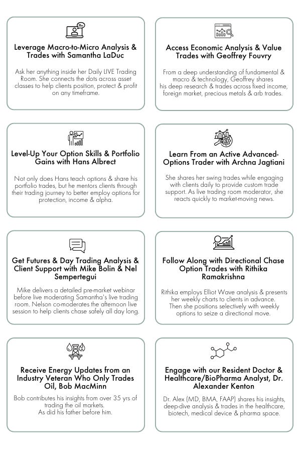 Don’t miss this exclusive opportunity to trade with Samantha and her incredible team of 9 subject matter experts every day in her Live Trading Room and Slack trading desk.
