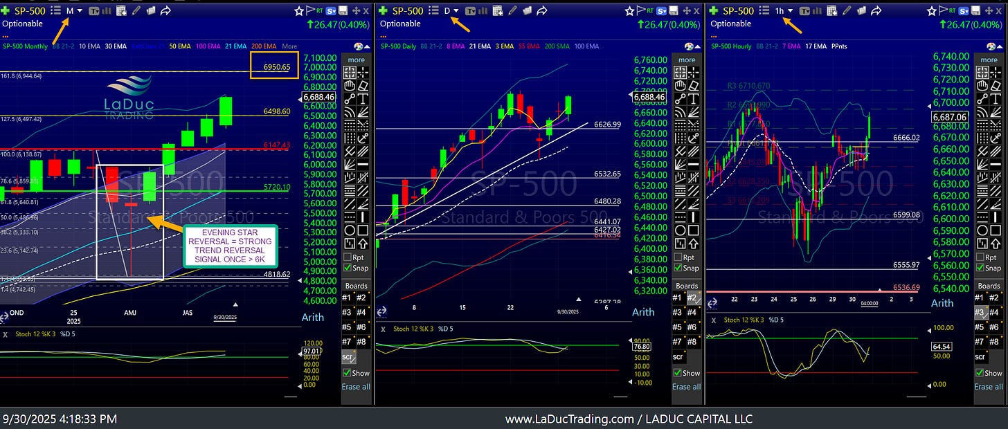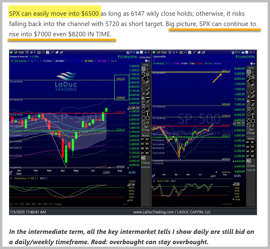 What you will also notice is the Fib retracement I threw on back in early July where I gave the upside, big picture SPX price targets of $6500 to start - later highlighting an overshoot to 6666 before potential volatility into Govt Shutdown. I also highlighted an upside of ~$7000 with $8200 possible in crack-up boom / dollar devaluation backdrop. It’s still in play IN TIME!!