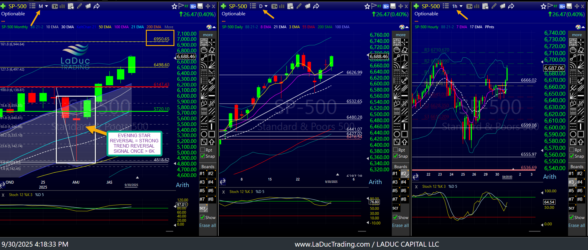 6713 is top of monthly Bollinger Band = time for digestion/chop sideways that can result in reversion to mean shorts once above levels trigger