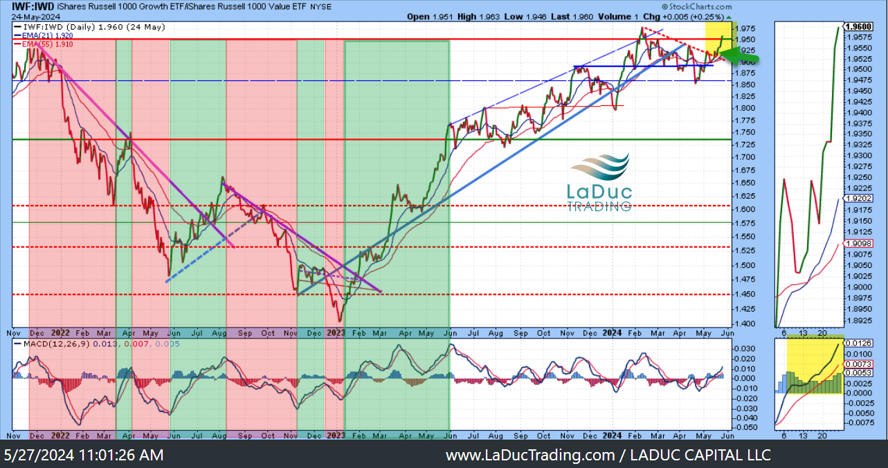 Daily I have highlighted my growth-to-value ratio (see below), which still shows a growth rotation past few weeks. No change yet, even if SPX hasn't moved back above my line-in-sand $5340 SPX.