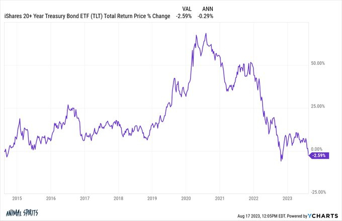 Ben Carlson reminds that long-term US government bonds (TLT) now has a negative total return going back 9 years (obviously even worse w/inflation). See chart below.