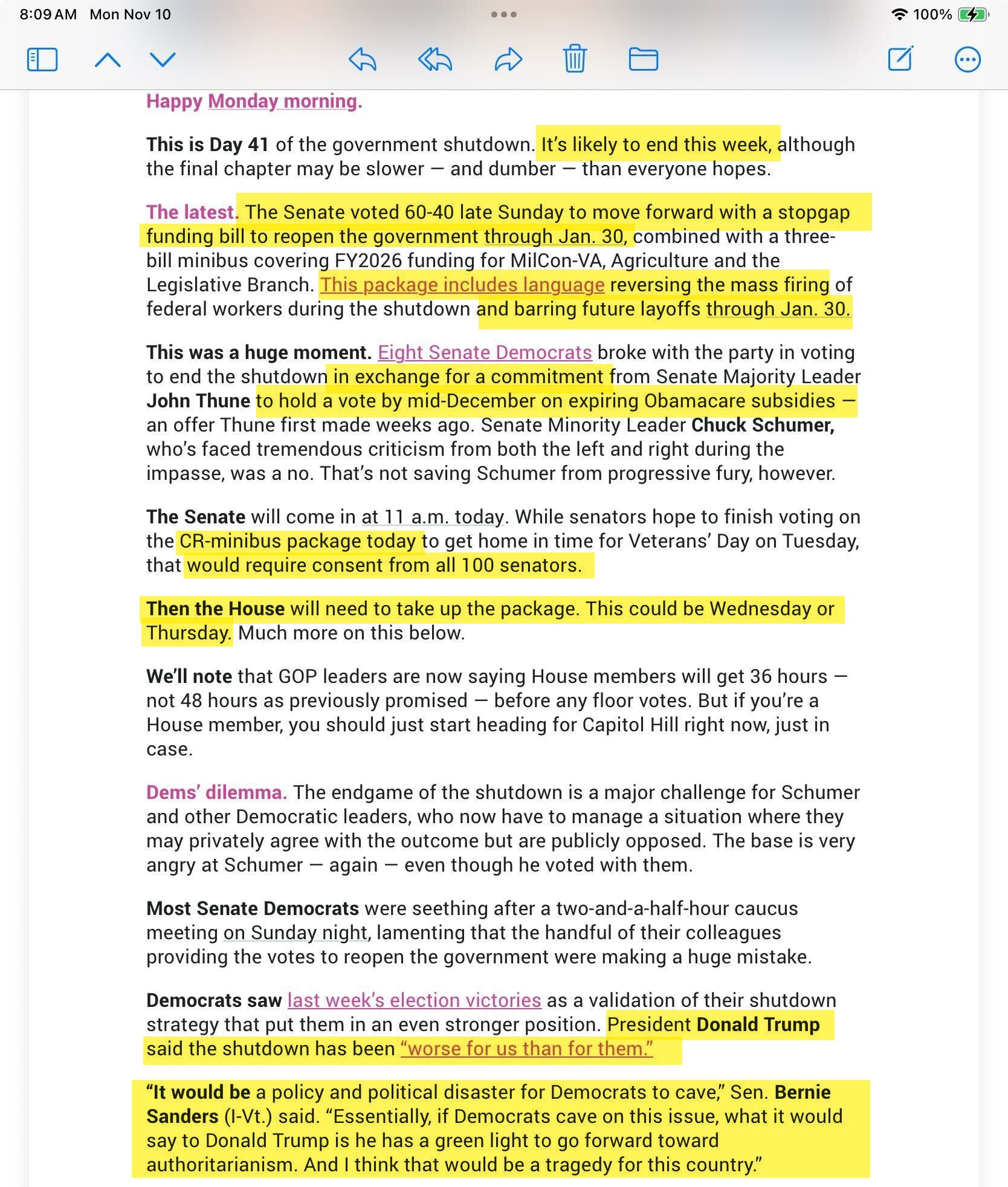 During this 41-day government shutdown, Trump lost ground in Tuesday’s election, had his favorability polls plummet, and then when SNAP benefits ended same day of his Great Gatsby party in Mar-a-lago, an uptick in news of food lines grew. Then Saturday, military uniforms flanked food banks and Sunday the shut down is promised to end and with no real concessions - just promises for a mid-December vote on the Affordable Care Act before government funding runs out in January.