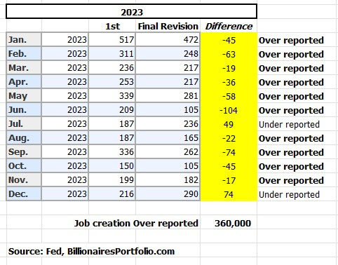 Now, look at 2023. BLS did the opposite and OVER-reported job growth by 417K jobs by the time Fed paused their rate hiking on Nov 1st, 2023.
