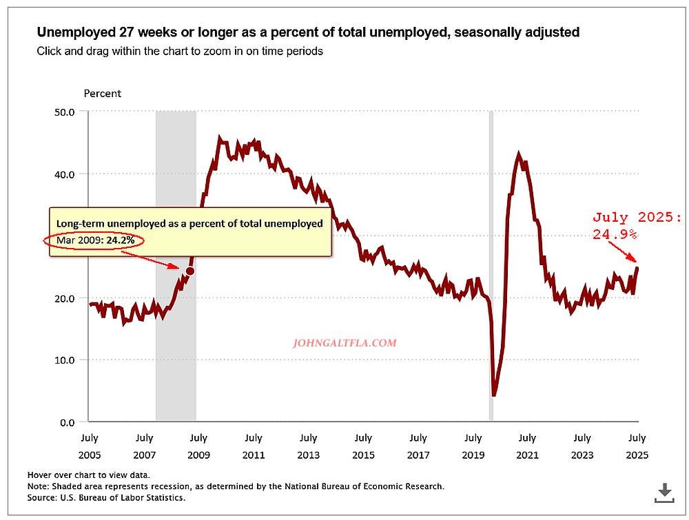 Unemployed 27 weeks or longer as percent of total unemployed, seasonally adjusted, now equals March 2009 levels, right after a major economic crash and before a massive regime change of Fed QE.