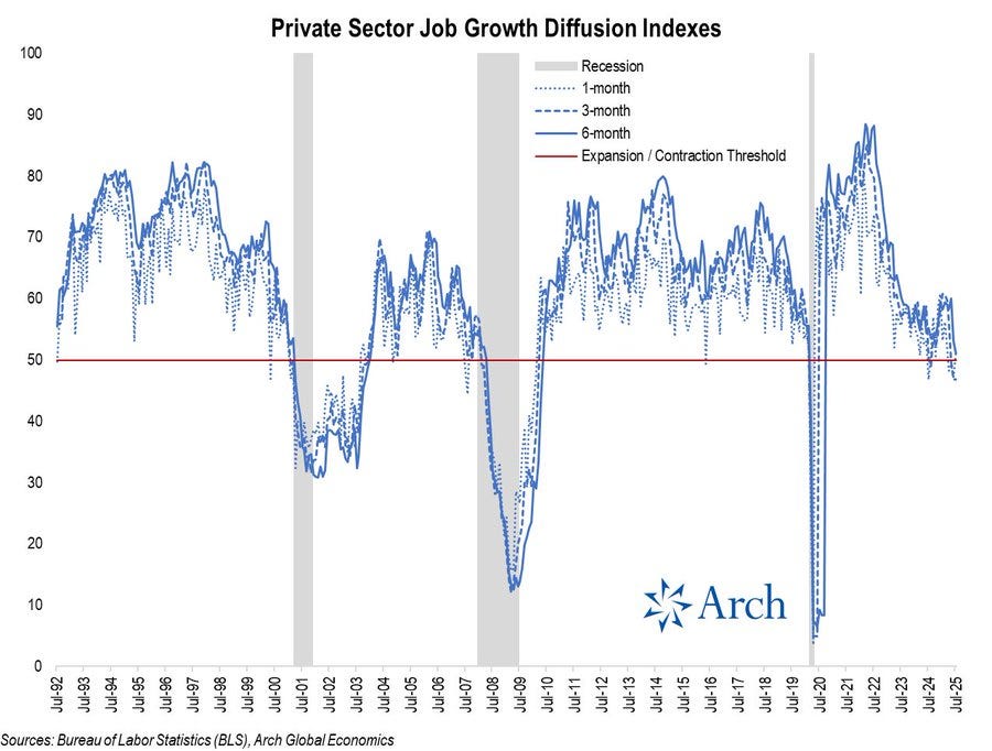 “the private job growth diffusion index, which reflects the breadth of job gains across industries. The 3m index dropped below the 50 expansion / contraction threshold back in May and remained at 46.8 in July, down from 60.8 back in Jan '25.