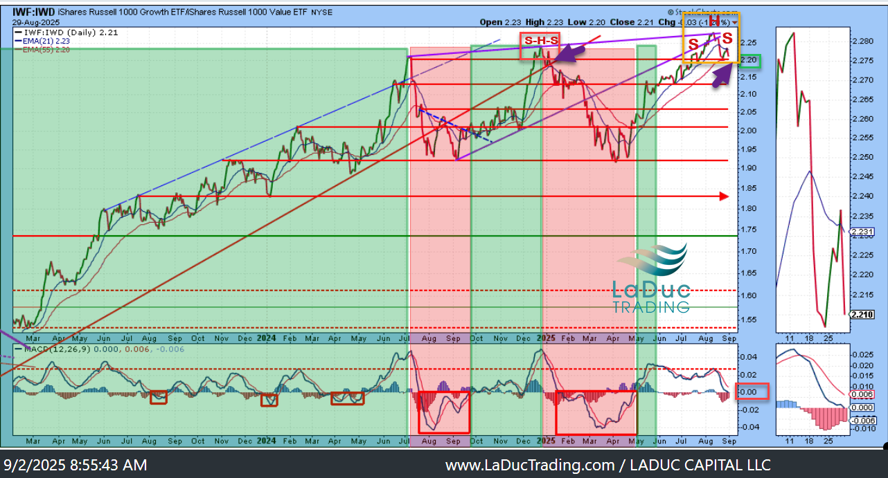Growth/value rotation risk: Ratio sitting on a 2.20 neckline (wide H&S). Below 2.2 with MACD < 0 = “bigger growth scare.