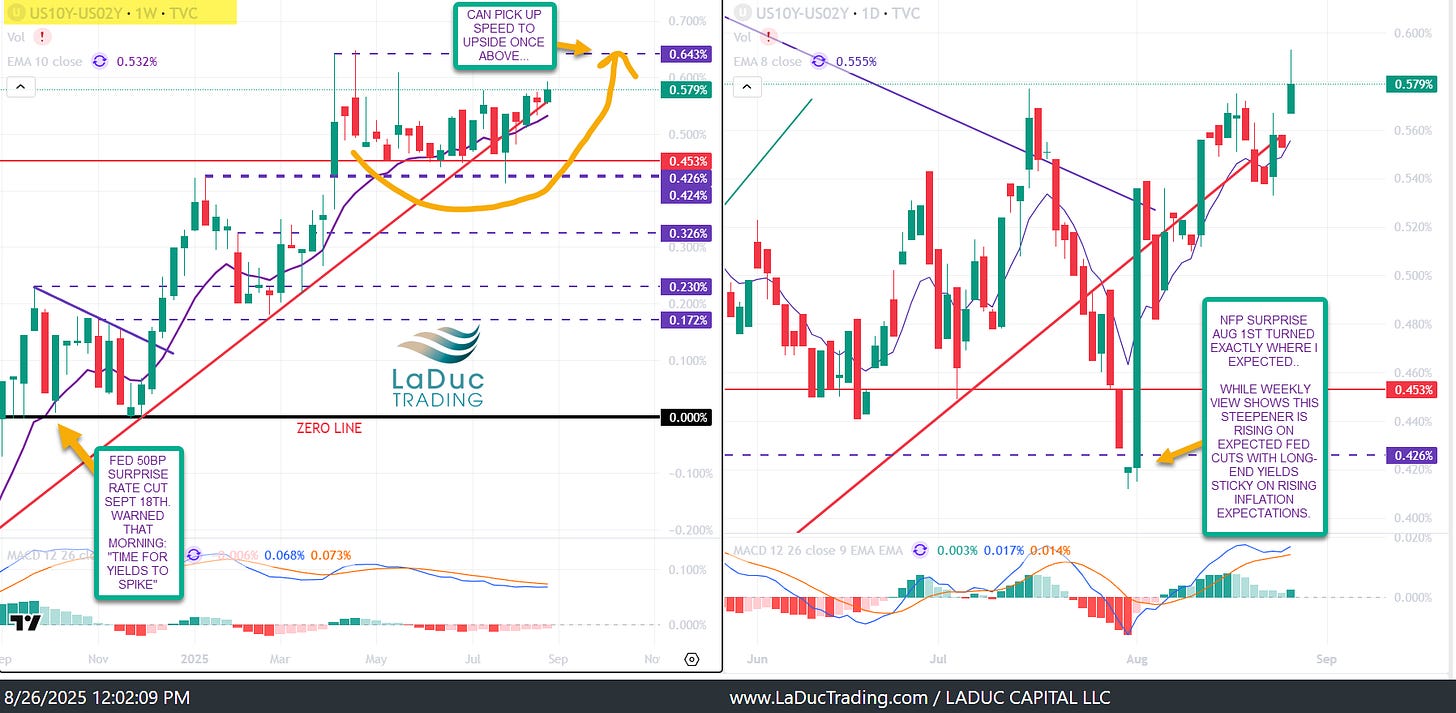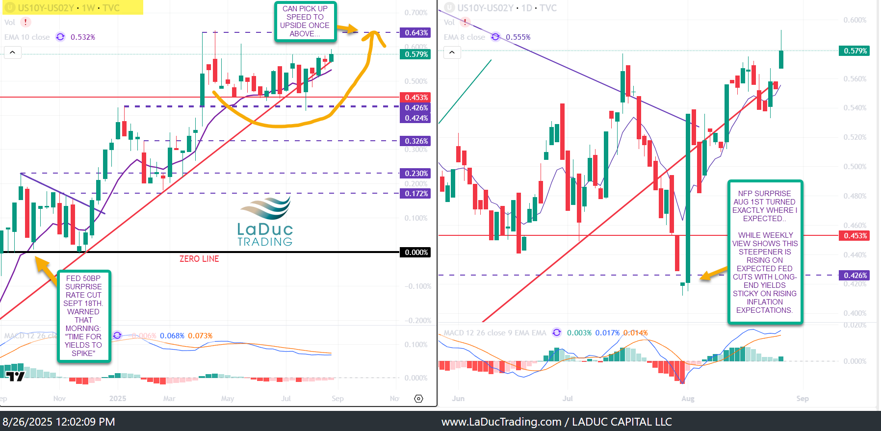 10Y2Y Steepener is ready to launch by ~October: where 2-year yield falling faster than 10-year; a break > 0.64 should cause steepener to pick up speed, coinciding with equity stress.
