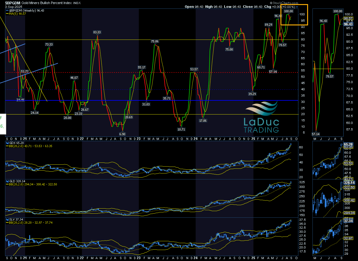 Gold/Silver/Miners: Parabolic move; GDX 67–68 = exhaustion zone → caution for shakeout. SIL also going parabolic. No macro/technical trigger to short.