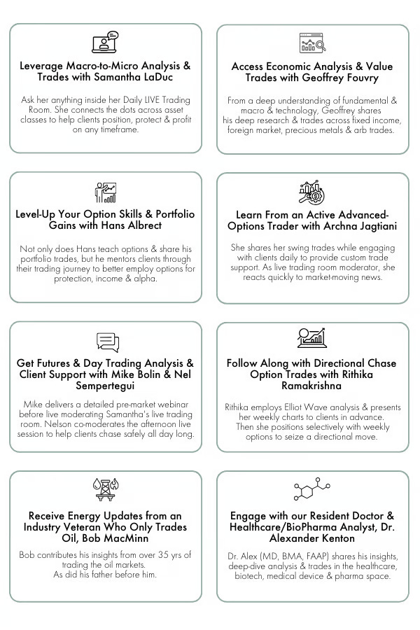 Behind every one of Samantha’s prescient market calls is a team of specialists—from options experts to economic analysts—each adding their edge so CLUB members can trade with confidence.