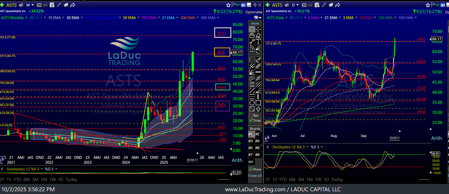 At $65, ASTS is either turning into another parabola with a $77 next price target based on my monthly 161.8 Fib level, or will base/consolidate here (127.5 Fib level) next few weeks.