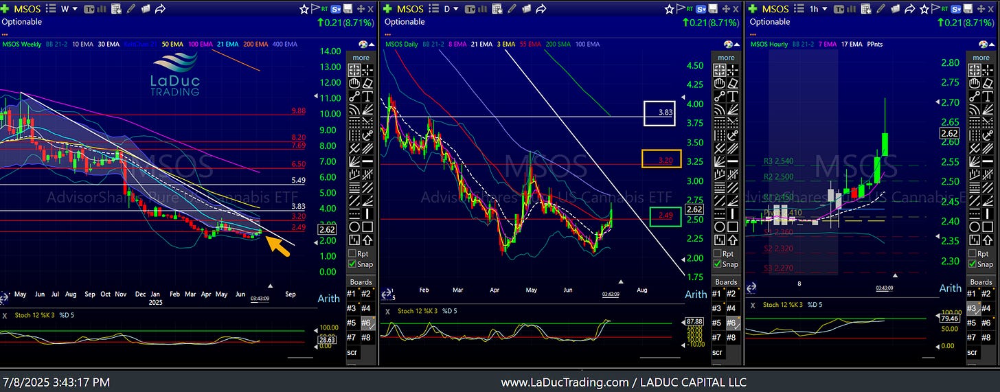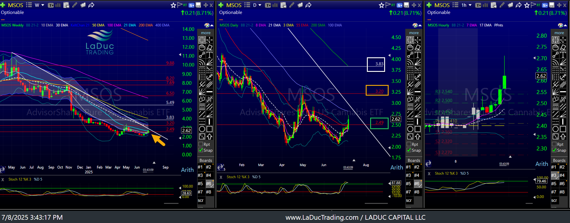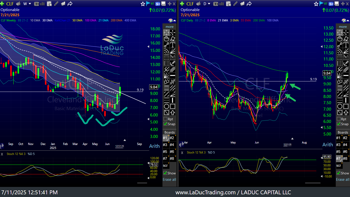We have spent a fair amount of time each day sizing up the bottom fishing plays - where a weekly 10/21 crossover is in play with bullish weekly candle formations +/or patterns. Examples: KSS > 9.96, TGT >103, BIDU > 90.45, JBHT > 156.74, BTU > 15.60 - but they haven’t triggered. CLF > 9.19 and MSOS > 2.75 already did.