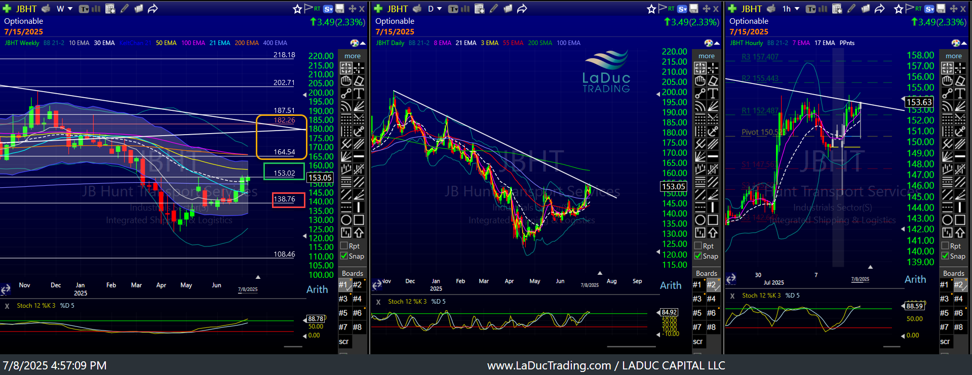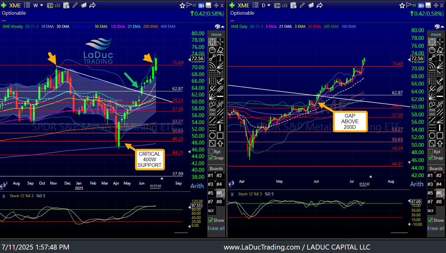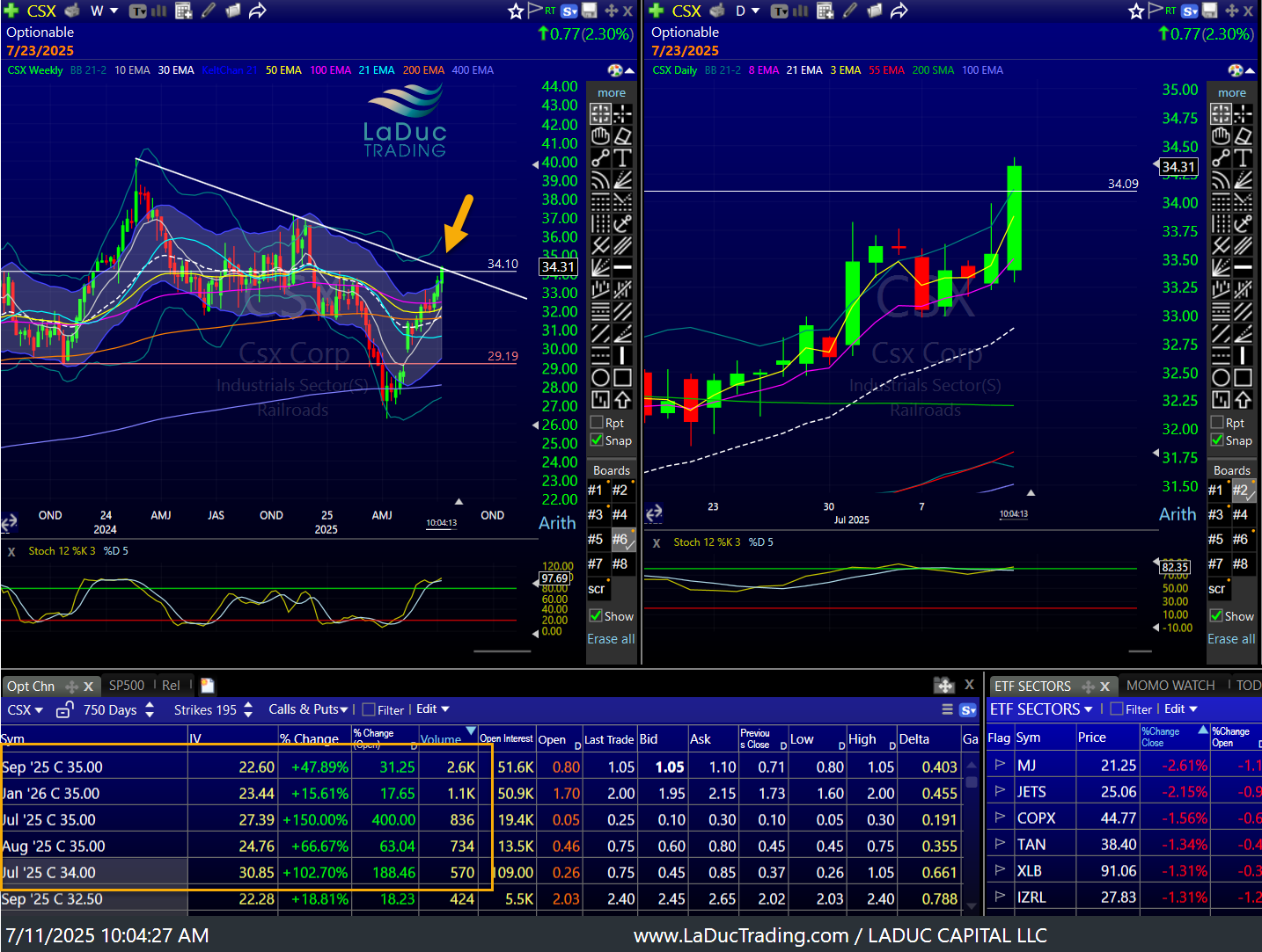 Other patterns for continued breakout are the descending weekly trendline - which serve as PT long and then support once above. Examples: UUUU > 6.70, CSX > 34.10, RCAT > 7.95, ACHR > 11.84, BA > 215, FCX > 48, UFO > 29, COPX > 47, NEM > 59.