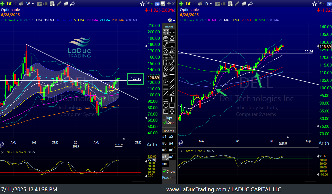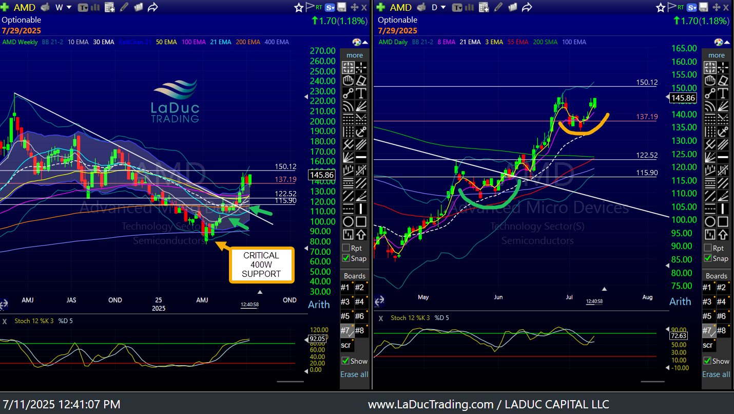 The descending weekly trendline with the weekly scoop pattern with the critical 400W support… has also been especially profitable set up for higher. Example is AMD - in play since bouncing off critical 400W support then tagging that trendline at 121 which formed a great scoop pattern and now needs > 150 in yet another daily scoop pattern.