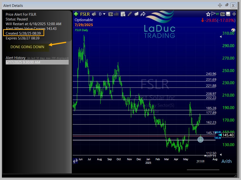 FSLR was a great (anticipated) buy alert at 138 before spiking to 188, but I also said this one will take MONTHS of chopping about in this range before it’s a better/safer trend reversal, bottom fishing play long.