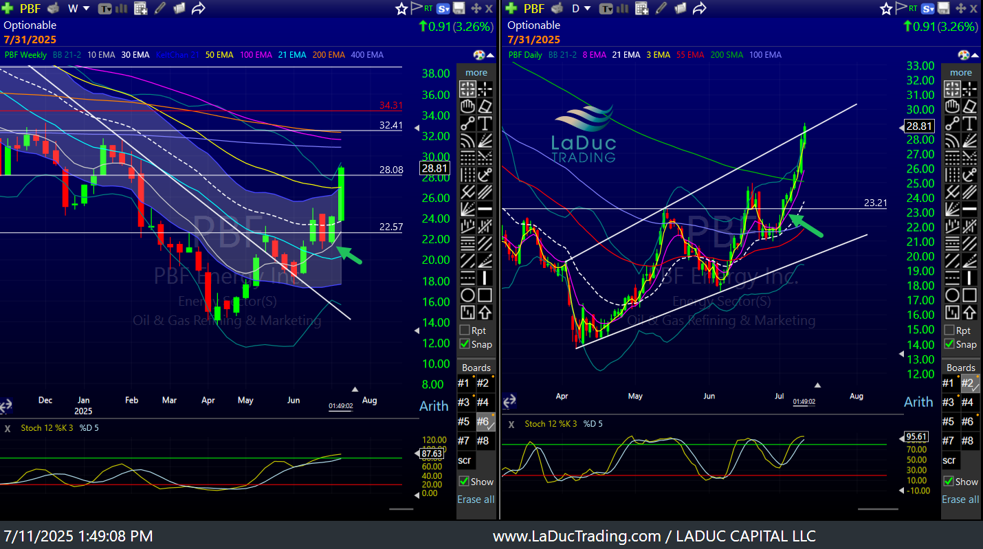 PBF is still working its way TO its 400W! Client Brian says it has $25/share in real estate, so big picture, this one looks good, but now it needs to base above its 200D. It will require more patience.