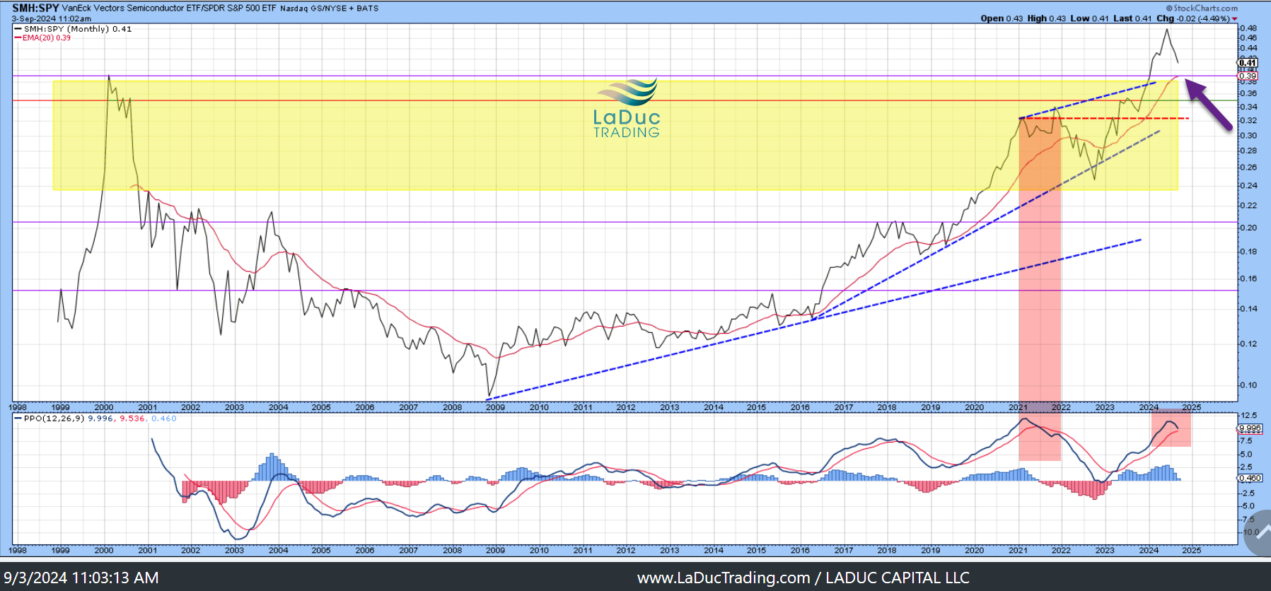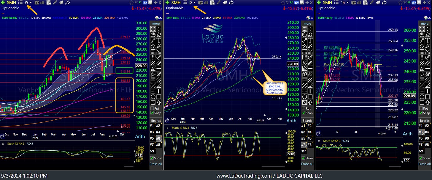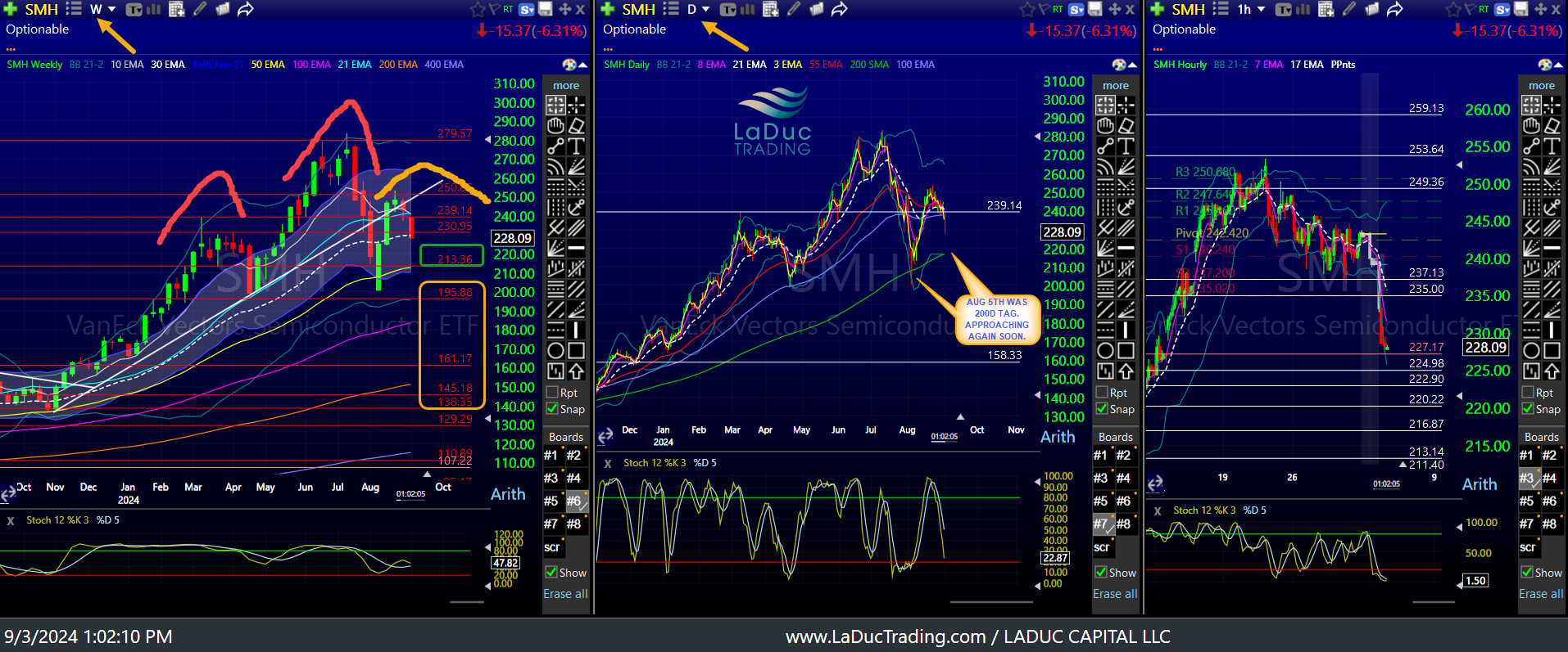 Big Picture, I still see a giant H&S on SMH weekly which only confirms once it gets/stays below $200 (August 5th lows) which would then brings us back (in my opinion) to at least November 1st 2023 levels before the "Fed Pause & Yellen Yahtzee" kicked in.