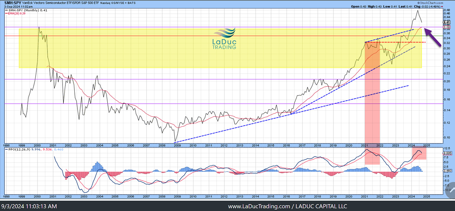 As posted two weeks ago, and reviewed weekly as part of my sector rotation tells... Semis are falling back down to earth.
